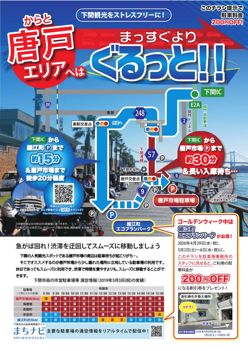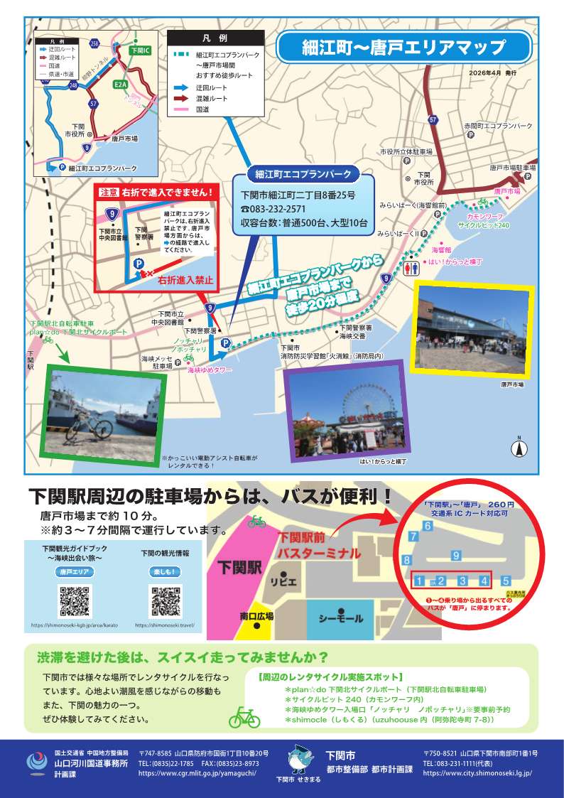 この度、国土交通省と下関市が連携して細江町エコプランパークの利用促進チラシ『唐戸エリアへはまっすぐよりぐるっと!!』を作成しました。
