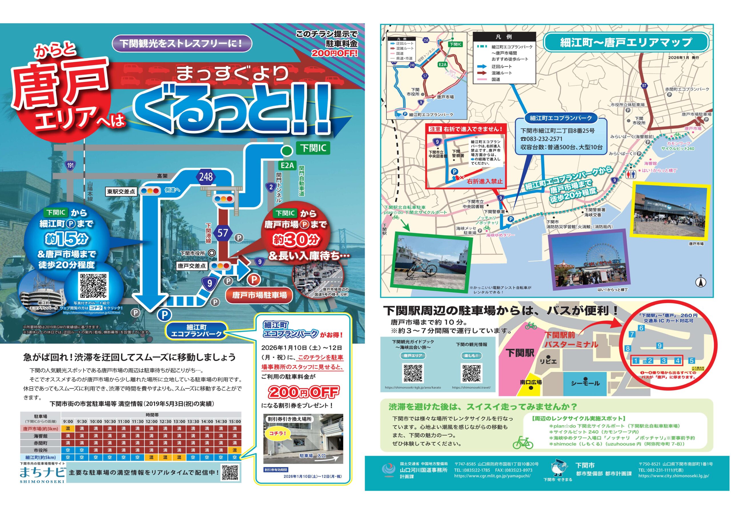 この度、国土交通省と下関市が連携して細江町エコプランパークの利用促進チラシ『唐戸エリアへはまっすぐよりぐるっと!!』を作成しました。